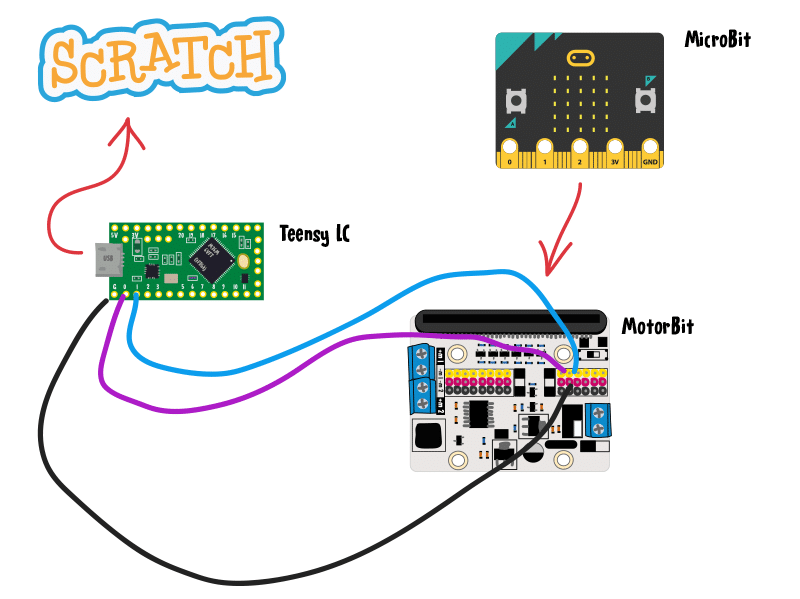 Her er en proof of concept video hvor jeg har programmeret en Micro:Bit til at sende seriel-data ud af pin 13 og 14 og hen til en Teensy LC´s pin 0 og 1 der så omsætter de serielle beskeder til tastaturtryk der så styrer en lille Scratch-test jeg har lavet hvor en rød klat skifter størrelse. Ret basic – men det er altså et setup jeg kommer til at undersøge mere her på siden.